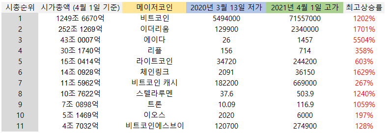 작년 코로나 쇼크로 매수하기 가장 좋았던 타이밍인 2020년 3월 13일의 저가를 비교해봤어.역시 굳건한 시총 1위는 변함없이 비트코인이지!