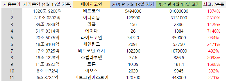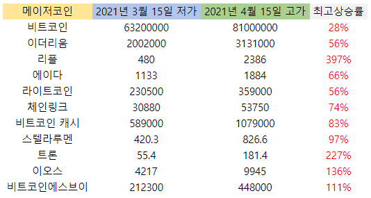 * 메이저 불장의 시작, 알트장으로 이어질까?(2021년 3월 15일, 4월 15일 기준 빗썸 메이저 분류 참고)