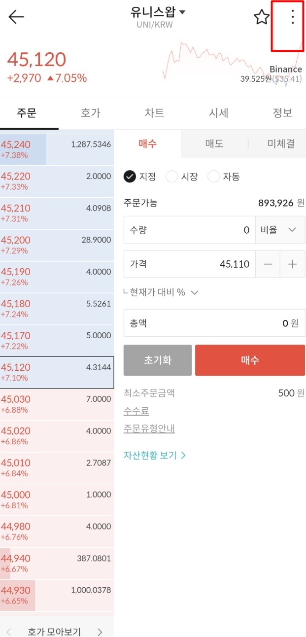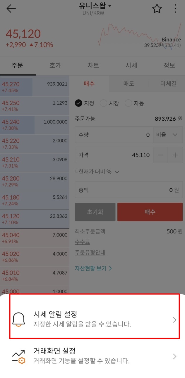 시세 알림설정, 거래화면 설정 선택지가 뜸