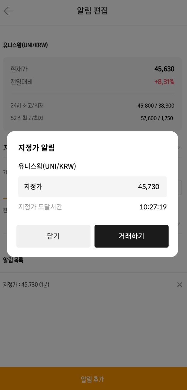 설정한 가격까지 올라오거나 내려가면 팝업창하고 푸시가 같이 뜸