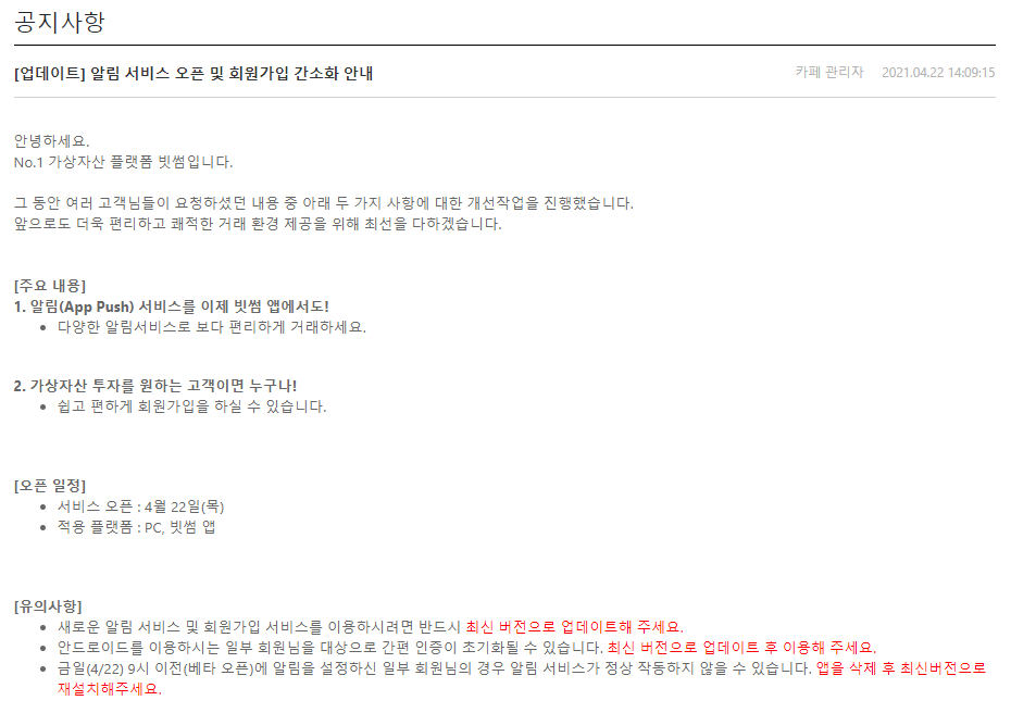 빗썸 앱푸시가 업데이트 되었다